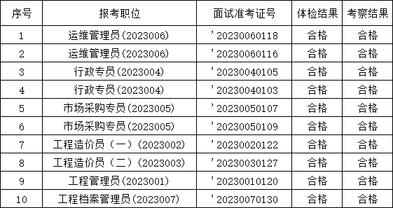 根據《亳州魏武國有資本投資控股集團有限公司2023年工作人員公開招聘》相關規定,現將擬入圍對象體檢、考察結果公示如下: